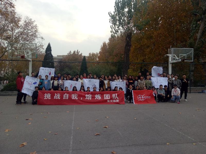 2019年11月12日下午两点整,由双元教育主办,山东交通学院经管学院协办的“挑战自我,熔炼团队——2019级金融学素质拓展活动”在山东交通学院无影山校区成功举办。参加此次活动的有双元教育实训就业部门负责人高原、双元教育实训中心副主任王国钰(担任本次拓展的教练)、双元教育校区主管张玮华老师以及19级金融学全体同学。