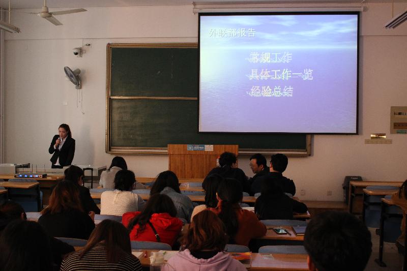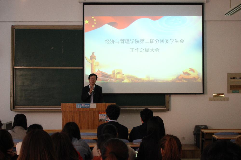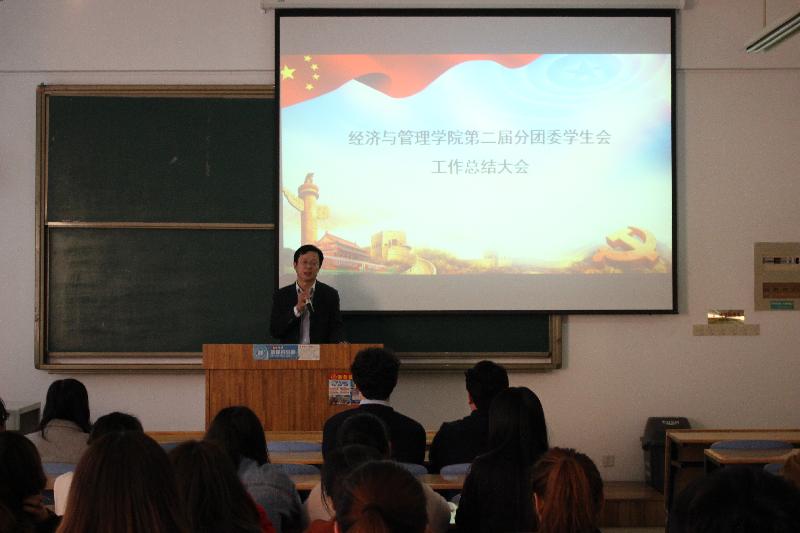 刘江老师对学生会工作总结的重要性进行讲解,大会在刘江老师的致辞中拉开了序幕。经济与管理学院分团委学生会各个部门按顺序上台对2017-2018学年第一学期工作任务进行了激情洋溢的工作汇报,根据本部门ppt对上学期工作做出细致的总结,给老师及学生干部们献上一场视听盛宴。分党委副书记王洪鹏对大家的汇报给予了充分肯定。结合本次工作总结,他对学生会成员在下学期工作中提出以下几点要求:第一、希望全体部门以身作则,相互配合。要求大家对待工作要细致耐心。第二、对于4月份即将到来的运动会,有关部门要做好准备工作,制定相关方案,争取取得一个好名次,对于有特长的学生,平时要积极训练,努力发现自己的短板并及时补足,在最后的比赛中有一个大突破。第三、在工作中要有大局意识,有自律意识,做到扎实为人民服务;第四、要有创新意识,自我成长意识,学生干部每一学期都要进行民主评议,做到公正平等。