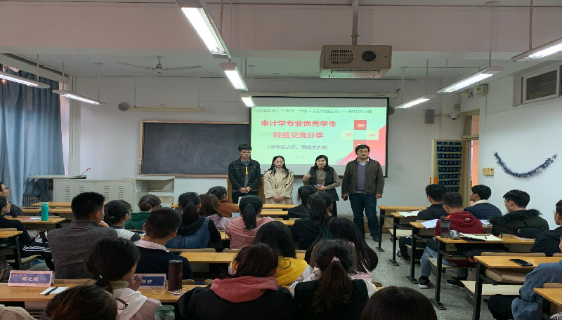 2019年11月5日下午,经济与管理学院教工第五党支部与学生一支部在无影山校区一号教学楼1215教室召开“不忘初心、牢记使命”主题教育暨审计学专业优秀学生经验交流分享会。此次活动邀请学生第一支部优秀学生党员王成、赵瑜进行学习交流,审计191班全体同学参加,活动由审计会计系主任唐学宝主持。