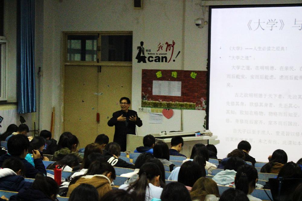 时为十月,序属金秋。经管学院国学社为弘扬、传播优秀传统的国学文化知识,帮助同学们认识并建立古之君子对待人生的积极态度。于20161027日在1号楼AB201教室举办了本学期第一次“道德讲坛”讲座活动。