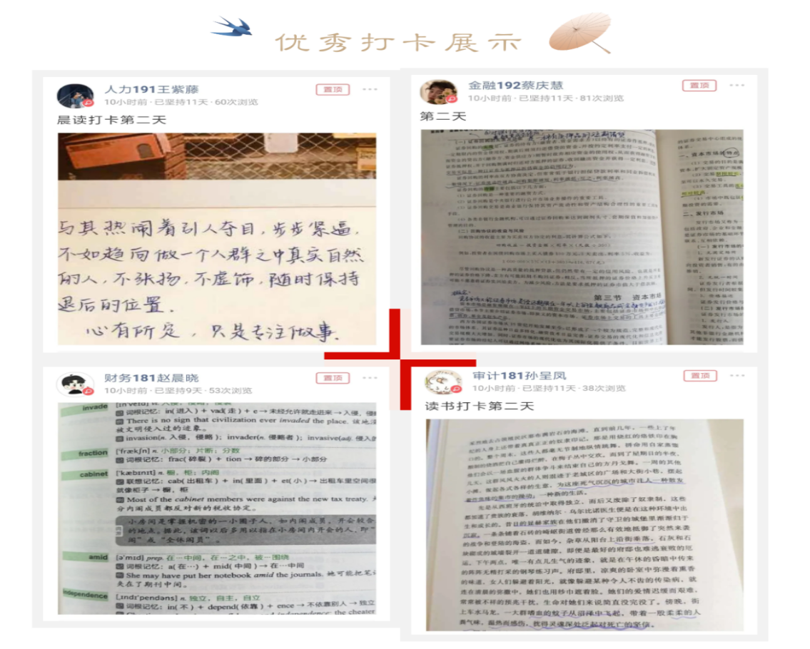 通过这次晨读打卡活动,同学们共同监督、共同学习,丰富了同学们的学习生活,提高了同学们的学习热情,为营造良好的学习氛围起到促进作用。