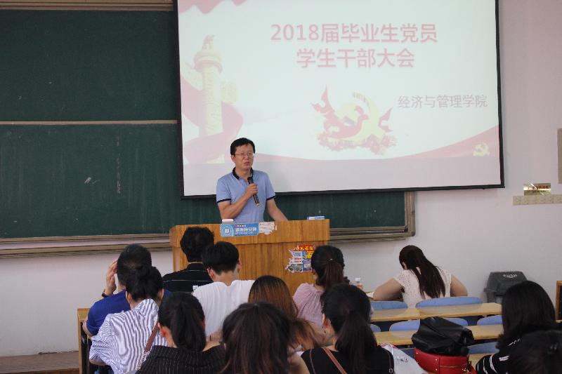 6月27日下午,经济与管理学院2018届毕业生党员学生干部教育大会在1号教学楼A座203教室召开,学院常务副书记王洪鹏,分团委书记亓秀梅和辅导员刘江出席了本次会议,我院毕业生党员、学生干部100余人参加了会议。