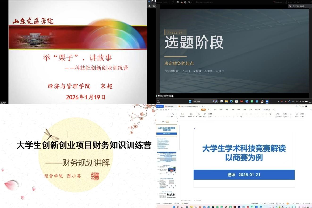 自1月中旬启动以来,训练营围绕创新创业与学科竞赛需求,先后开展七期专题课程。大数据管理系赵品华老师、人力资源管理系宋超老师、数字经济系陈晓红老师、金融系李坎勇老师、财务管理系陈小英老师结合各自专业领域,为同学们系统讲解营销知识、科技竞赛备赛要点、项目策划思路及财务基础知识等内容;同时,金融224班杨坤同学以及“π创”科技社副社长向春燕、孔凯歌、葛小涵等学生代表结合参赛经历,分享竞赛经验与实战技巧。