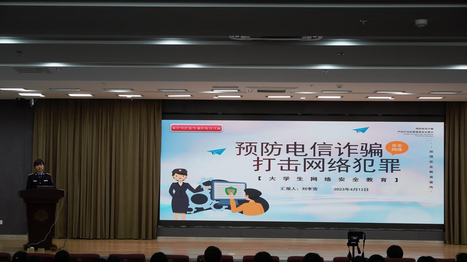 讲座过程中,女警先锋宣讲团对我院大学生展开安全教育系列宣讲。来自分局交警大队、网安大队、大学路派出所等单位的三名民警,围绕防盗反诈、网络安全、交通安全、女性安全和毒品危害等方面开展讲授和互动。她们引用辖区内发生的真实案例,结合当下青年学生关心关注的热点话题,通过诙谐幽默的语言,教育同学们增强安全意识和自我防范意识,从源头有效预防和降低安全事故,谨防电信诈骗、安全文明上网、遵守交通规则,做遵纪守法的最美大学生。