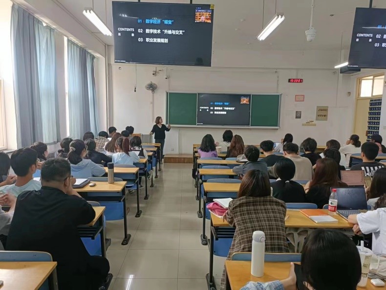 讲座中,周博总监深入浅出地讲解了数字经济的蝶变过程、数字技术的升维和交叉,并基于行业发展特点以及国家相关政策,给出了新时代发展中数字经济专业相关的职业选择建议。结合应用场景分析的讲座,指导了学生的职业规划,拓展了师生的专业视野,加深了师生关于数字产业化和产业数字化发展动态的行业认知。
