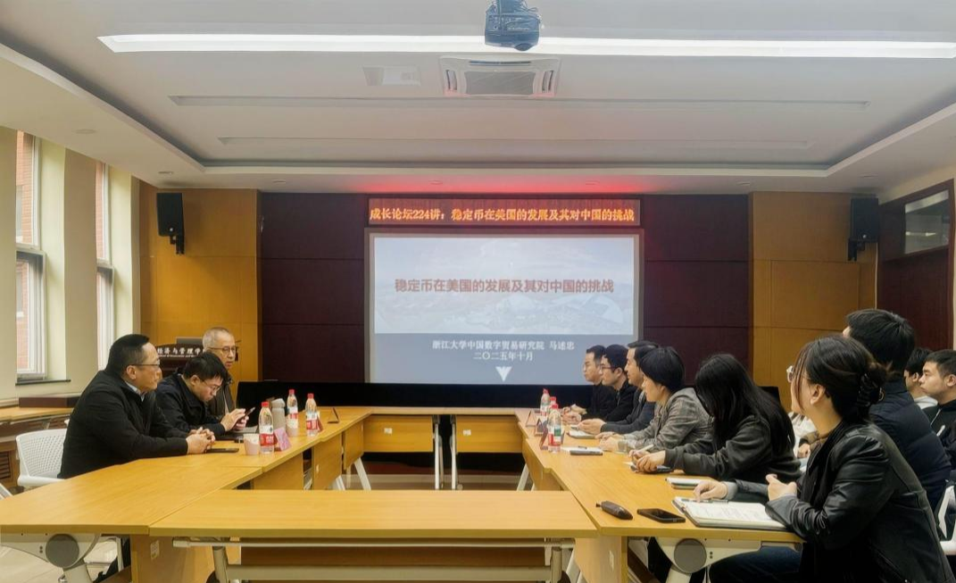 10月26日上午,由科研处主办、经济与管理学院承办的成长论坛224讲于经济与管理学院1B104举办。教育部长江学者特聘教授、浙江大学求是特聘教授马述忠应邀作题为《稳定币在美国的发展及其对中国的挑战》的专题讲座。浙江大学中国数字贸易研究院副院长张洪胜、浙江城市国际化研究院研究员易建安、经济与管理学院院长耿中元出席会议,学院金融系及数字经济系师生代表参会。会议由经济与管理学院学术副院长李彩红主持。