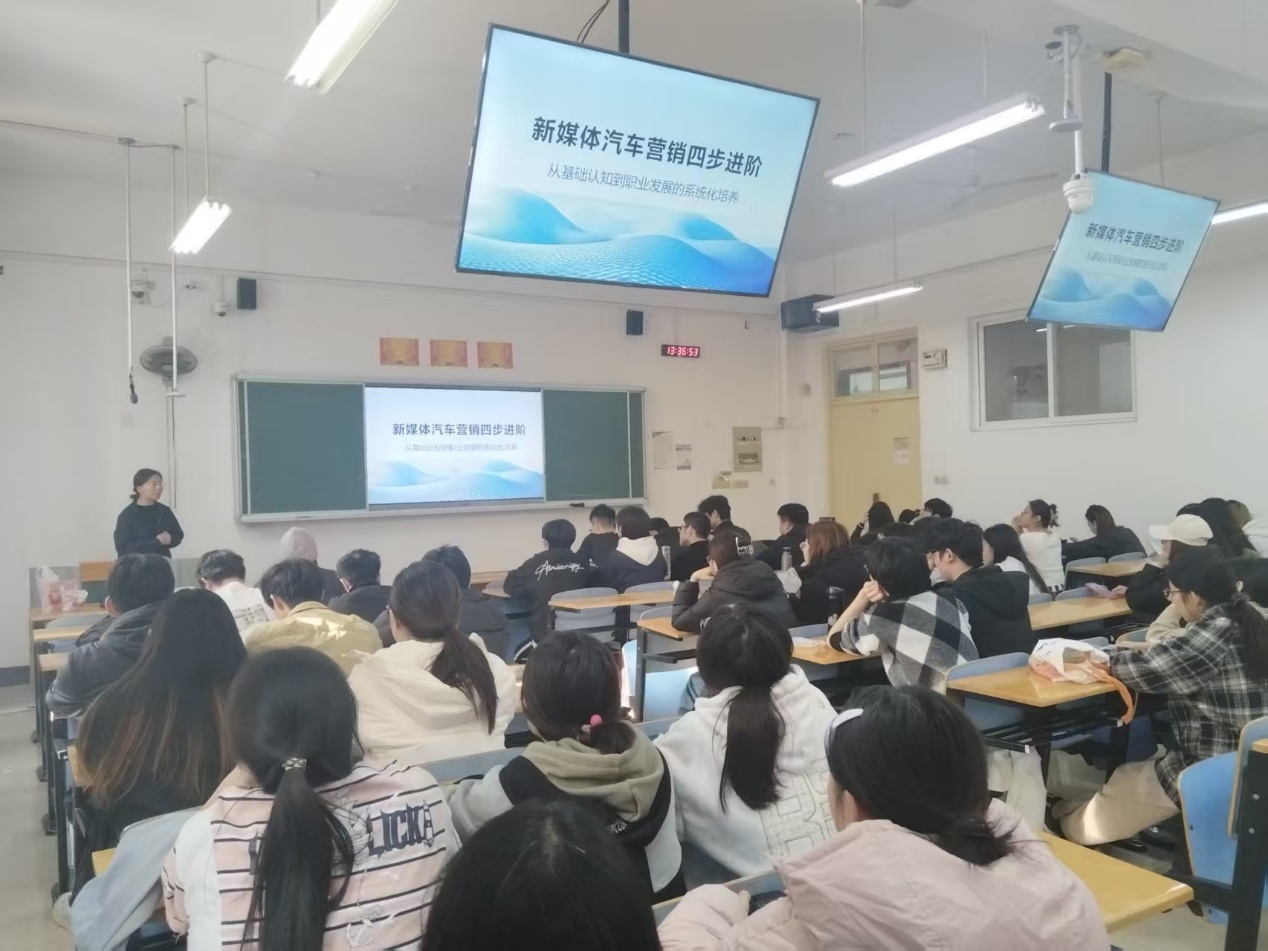 讲座中,张晓莉结合自身丰富的行业实践经验,围绕新媒体营销基础概念、汽车新媒体运营实战技能、账号定位与设计方法、行业发展前景与就业指导展开分享,系统深化了师生对新媒体运营逻辑与实践路径的理解。现场通过互动提问环节,张晓莉鼓励同学们拓展创新思维、强化技能储备,并针对职业规划、行业趋势等问题逐一解答。