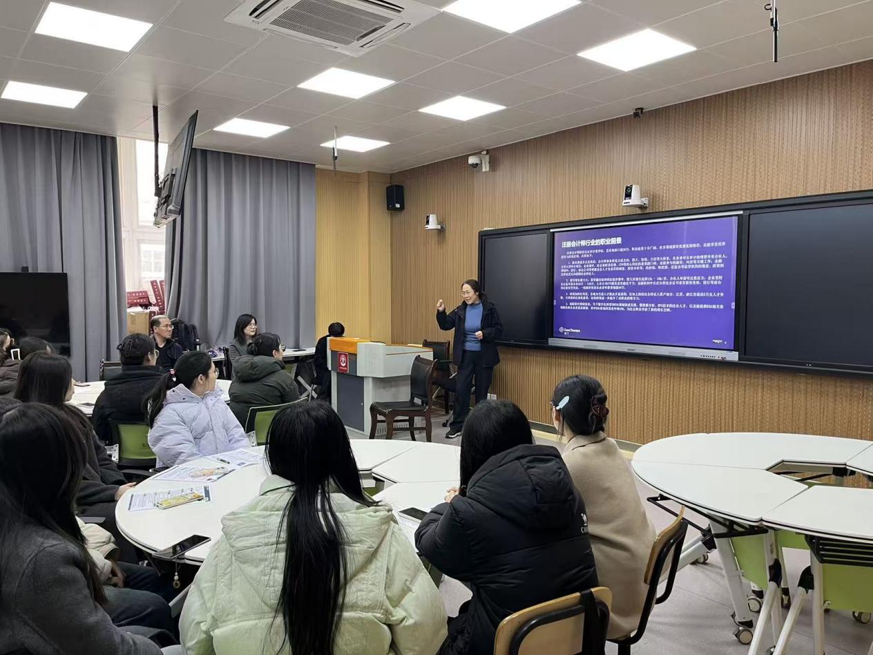 胡乃忠结合致同会计师事务所的实际情况,分享了事务所的工作特点与文化氛围,并通过员工成长案例鼓励学生提前规划职业目标,指导学生规划职业发展路径。