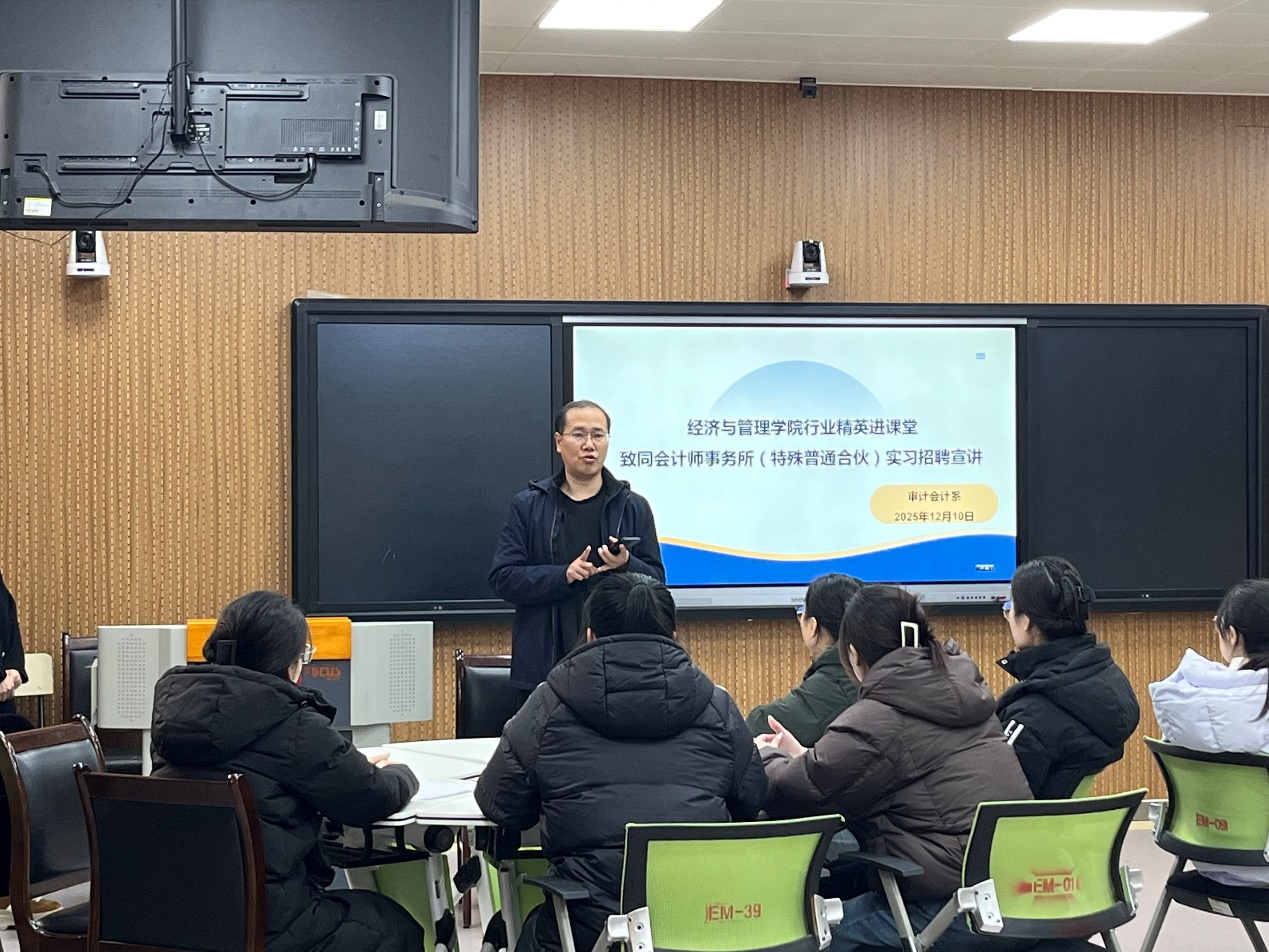 12月10日下午,经济与管理学院举办“行业精英大讲堂”系列活动,邀请致同会计师事务所济南分所合伙人胡乃忠、高级经理赵淑娟和审计业务总监刘民为审计系师生带来审计实务专题讲座。活动由审计会计系主任李玥主持。