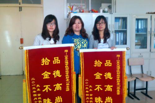 近日,财经学院学生董诗雪、姜海娜在长清大学城商业街捡到一个钱包,内有6000多元现金和银行卡、信用卡、身份证等重要证件。面对数目不少的现金,她们毫不犹豫地联系了附近的物业公司,又通过身份证等有效信息联系到失主,在信息确认无误后,钱包完璧归赵。失主对她们拾金不昧的品质给予赞扬,并送锦旗表示感谢。