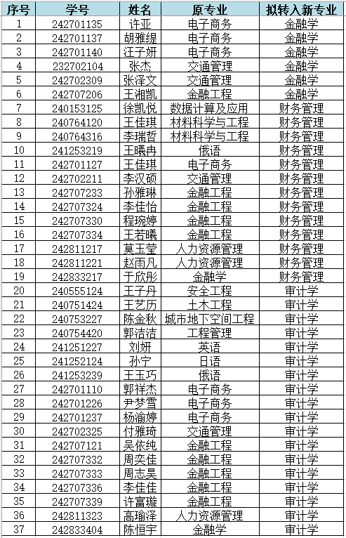 根据《山东交通学院普通全日制本专科学生转专业管理办法(修订)》(鲁交院发〔2020〕71号)有关规定,结合《2025年度本专科学生转专业工作方案》(教函〔2025〕69号)及《经济与管理学院2025年度本科学生转专业接收计划》,经学生报名、报名资格审查、报名资格公示,学院研究决定拟接收以下学生转入,现予以公示。公示期为2025年9月16日-9月18日,公示期内如有异议,请联系经济与管理学院教学管理办公室(电话:0531-80687728),公示期结束后不再受理。