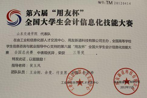 近日,第六届“用友杯”全国大学生会计信息化技能大赛总决赛落下帷幕。来自全国近400所高校的900多支代表队、4500多名选手获得全国总决赛的参赛资格。经过激烈角逐,我校财经学院学生组成的代表队荣获全国三等奖。