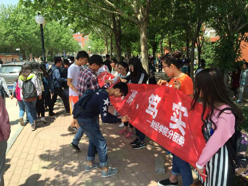 为进一步宣扬五四精神,认知、践行习近平主席提出的“勤学、修德、明辨、笃实”八字真经,财经学院于5月5日中午和5月6日晚上开展了“致青春,中国梦”五四系列活动之“横幅签字仪式”。活动以宣扬“八字真经”为主题,引导广大青年做社会主义核心价值观的自觉践行者为目的来进行。同学们积极响应,名字签满了整条横幅。