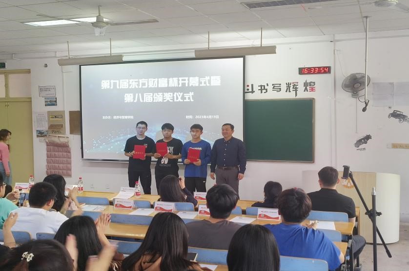 近日,第九届“东方财富杯”全国大学生金融挑战赛校赛开幕式暨第八届“东方财富杯”全国大学生金融挑战赛国赛我校获奖同学颁奖仪式在长清校区1号教学楼A座202教室顺利举行。本次开幕式由经济与管理学院“π创”科技社组织,邀请经济与管理学院院长耿中元、金融系副主任许冰、教师马媛媛为第八届“东方财富杯”全国大学生金融挑战赛国赛我校获奖者颁奖;特邀“东方财富杯”赛事企方人员陈洁晓进行专业知识讲解。