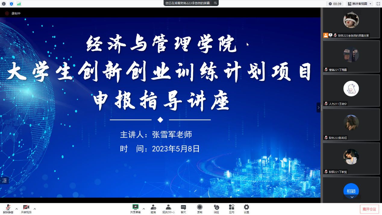 5月8日晚,经济与管理学院大学生创新创业训练计划项目申报指导讲座在线上顺利开展。本次讲座特邀经济与管理学院张雪军老师进行申报指导。