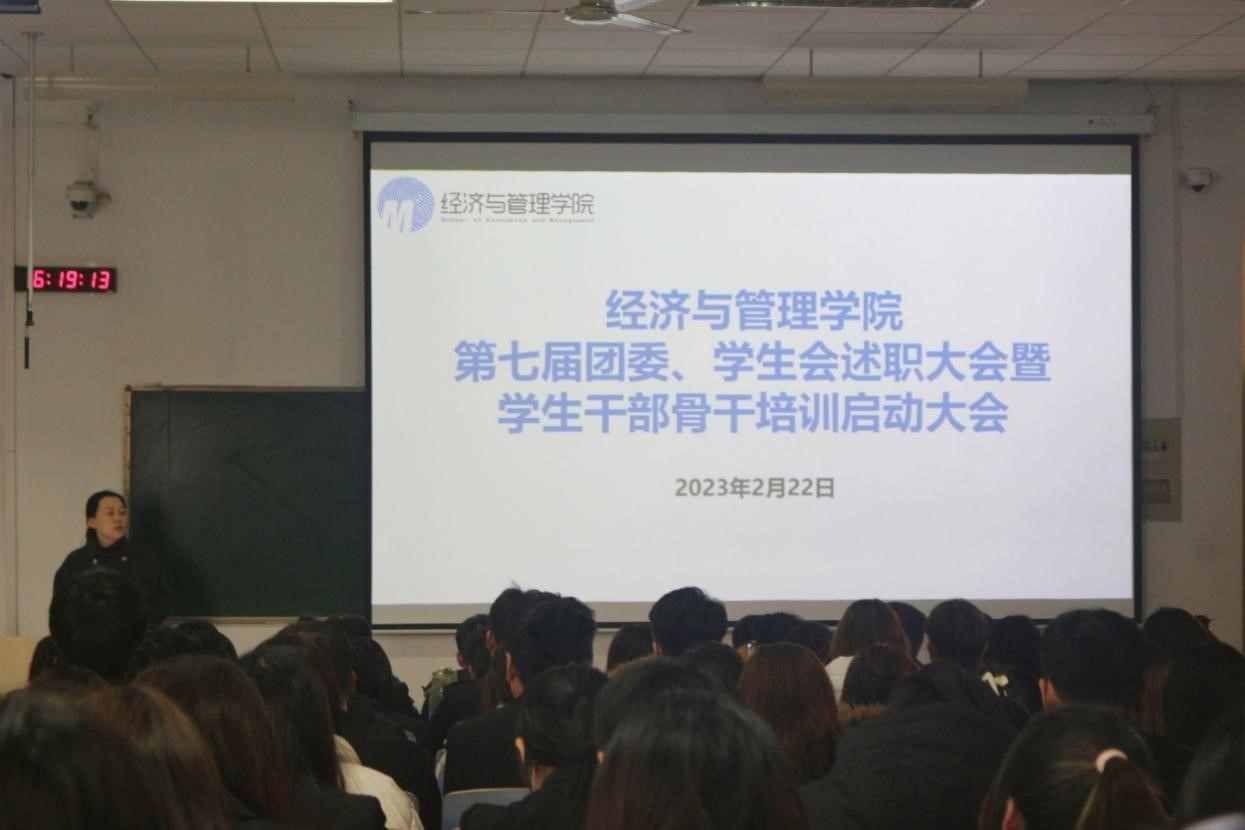 2022年2月22日经济与管理学院第七届团委、学生会述职大会暨学生干部骨干培训启动大会在1号教学楼AB201教室顺利召开。出席本次会议的领导有党委副书记王莉、团委书记单成巍,辅导员吴辉、孙翠翠、陈进、姜子颖、李迎赫。经济与管理学院第七届团委、学生会全体成员参与此次会议。