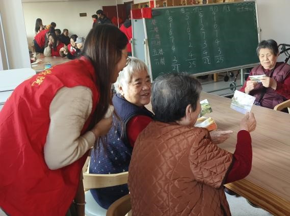 活动过程中,志愿者为每位老人赠送了寓意吉祥的祝福卡片,并耐心讲解卡片上的美好祝愿,字里行间流淌着对长者们的尊敬与关怀。祝福卡片,如同心灵的小舟,在这片温暖的海洋里,承载着志愿者的敬意,驶向老人心中的港湾。