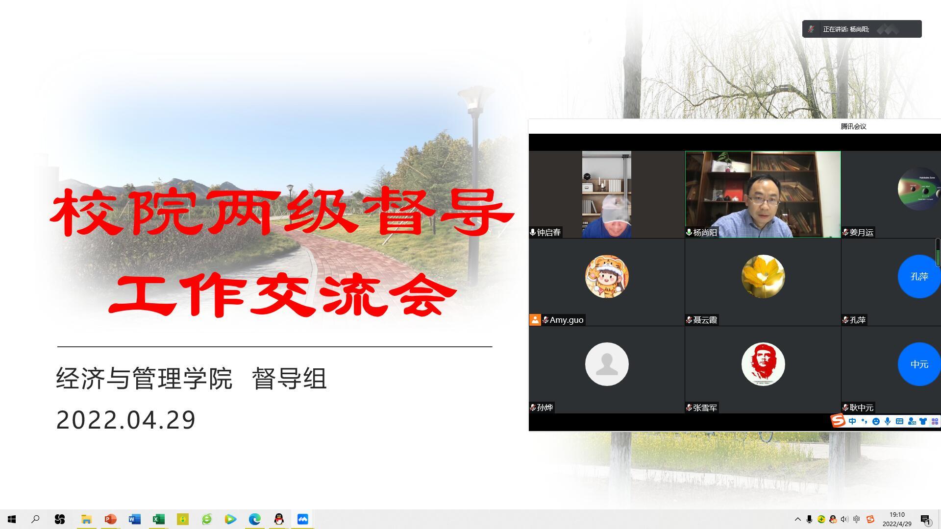 为不断强化教育教学过程管理,推动校院两级督导工作做深、做实,促进课堂教学质量不断提升,4月29日晚上,经济与管理学院召开校院两级督导工作线上交流会。学院领导、校督导、院督导、专业负责人参加了会议。会议由经济与管理学院副院长孙烨主持。