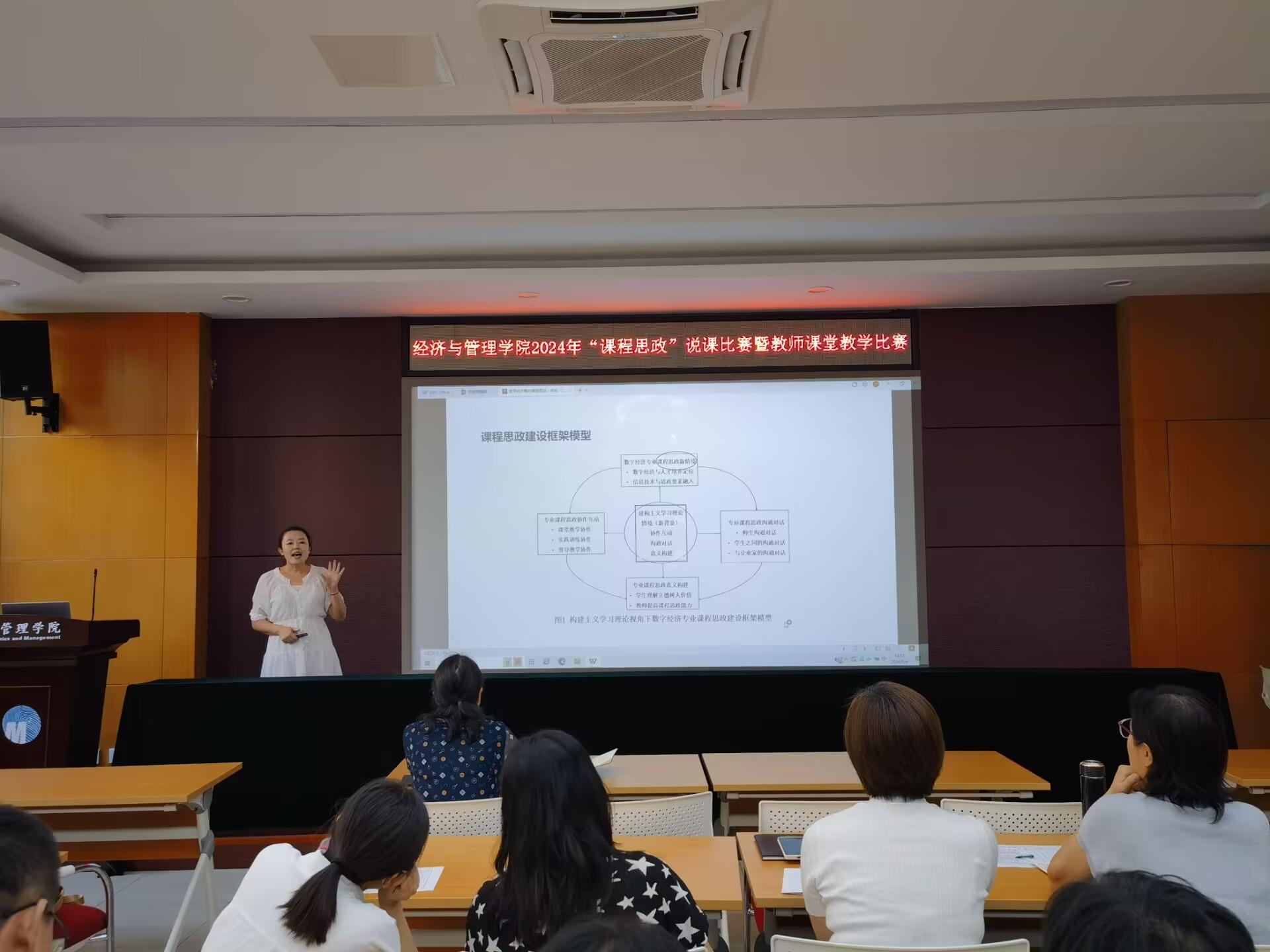 为落实立德树人根本任务,更好地将思政育人与专业课程有机融合,并为学校教学比赛选拔优秀选手,2024年9月5日上午,经济与管理学院课程思政暨教学新形态研究中心在1B104举办2024年 “课程思政”说课比赛暨教师课堂教学比赛,张文坤等5位青年教师参加比赛活动。比赛由副院长孙烨主持,学院督导组成员担任评委,学院青年教师和部分学生代表观摩了比赛。