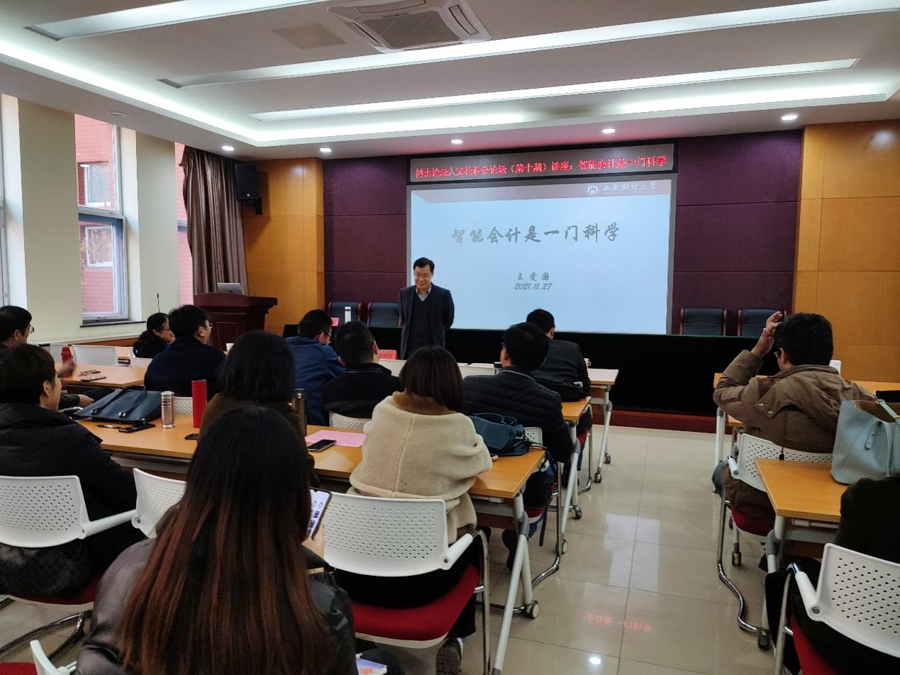 11月27日,由科研处主办、经济与管理学院承办的第十期博士论坛人文社科分论坛专题讲座在1B104会议室顺利举行。院长耿中元主持会议,我院部分教职工和学生参加了会议。本期论坛的主讲嘉宾为山东财经大学会计学院院长王爱国教授,讲座题目为“智能会计是一门科学”。