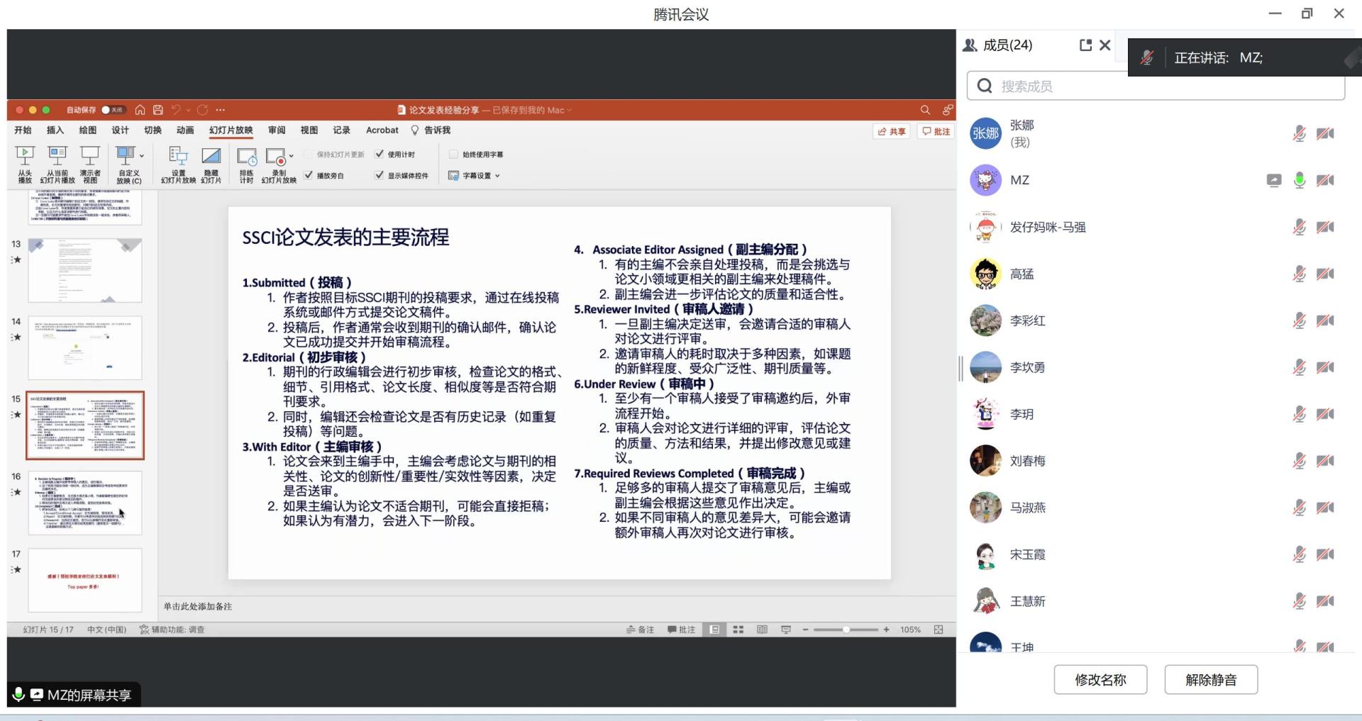 邹谧博士就“英文论文写作经验分享”这一主题进行经验分享,从论文的选题、期刊的选择、学术交流与合作、论文的写作流程和投稿等方面进行了详细介绍,分享了个人论文写作和发表经验。她详细介绍了英文文章审稿的通行流程,如Desk Review, Peer Review等。还有对于目标期刊的选取、翻译润色等,都给出了一些建设性意见。