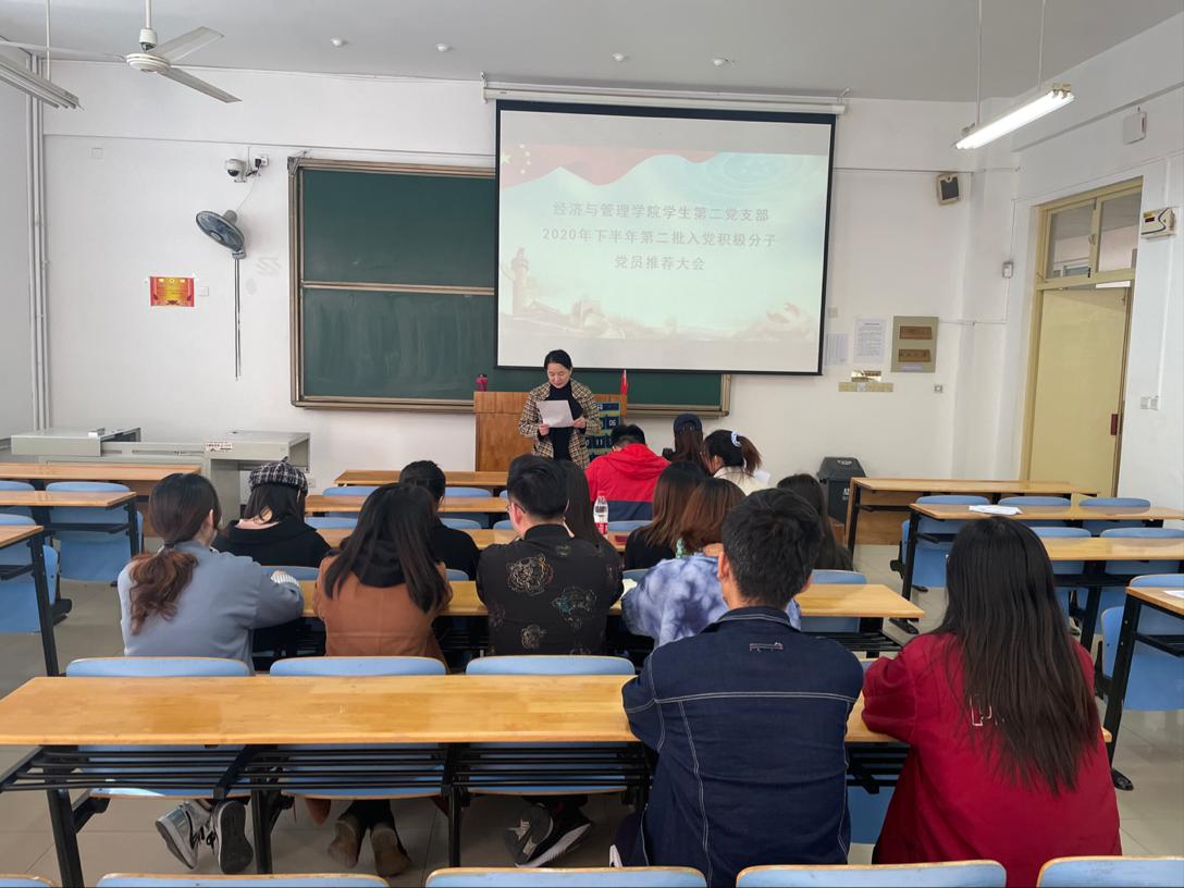 2020年11月4日下午,经济与管理学院学生第二党支部在长清校区1A207教室顺利开展2020年下半年第二批入党积极分子党员推荐大会,本次大会由学生第二党支部支部书记陈雅雯同志组织召开。本次会议主要是对新一批12名入党申请人的表现进行讨论并投票,最后选出符合条件的优秀入党积极分子。