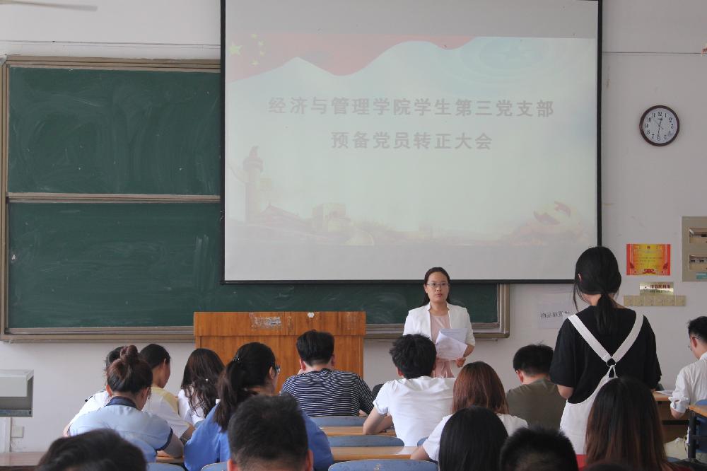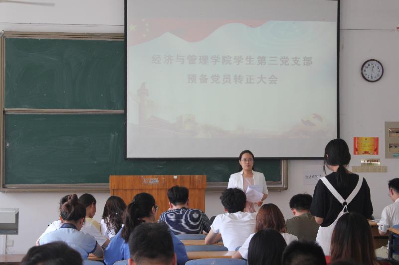 2019年6月24日,经济与管理学院学生第三党支部召开预备党员转正大会,大会由经济与管理学院第三学生党支部书记亓秀梅同志主持,学生三支部全体党员参与此次转正大会。