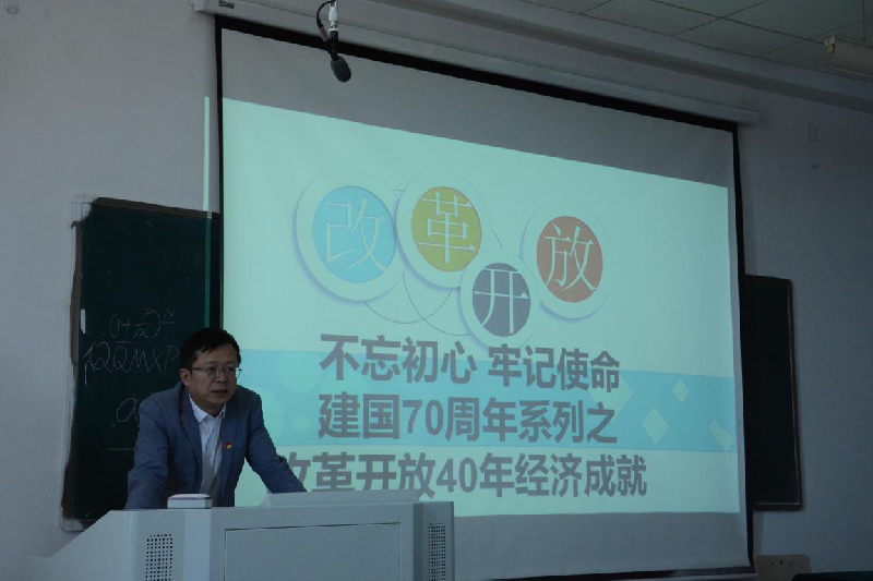 本次党课以“改革开放40年经济成就”为主题,王书记围绕“我国经济总量的变化、经济结构和产业结构的优化、创新型国家建设成果、交通建设成就”四个方面进行了讲解。第一,王书记讲述了经过39年的发展中国国内生产总值位居世界第二,人均GDP相比1978年增长了约155倍,我国进、出口总额和外汇储备规模都有不同幅度的增加。第二,农业、工业、服务业、智能产业都得到不同程度的优化。第三,C919大型客机的首飞、航母001A的下水等都是具有重大影响的科学技术成果。第四,我国路、港、桥的建设均取得了巨大成就。