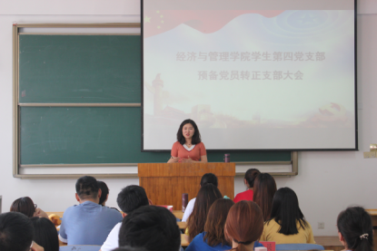 6月 24日下午,经济与管理学院学生第四党支部在1号教学楼A座302教室召开2019年上半年预备党员转正大会,大会由学生党支部书记孙翠翠主持,我支部24名学生党员参加会议。