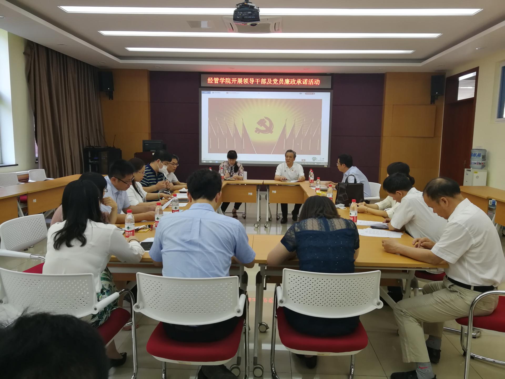 7月1日上午,经济与管理学院在1B104会议室开展领导干部及党员廉政承诺签名活动,会议由分党委书记赵中利主持,党员领导干部、辅导员及党员教师代表参加活动。