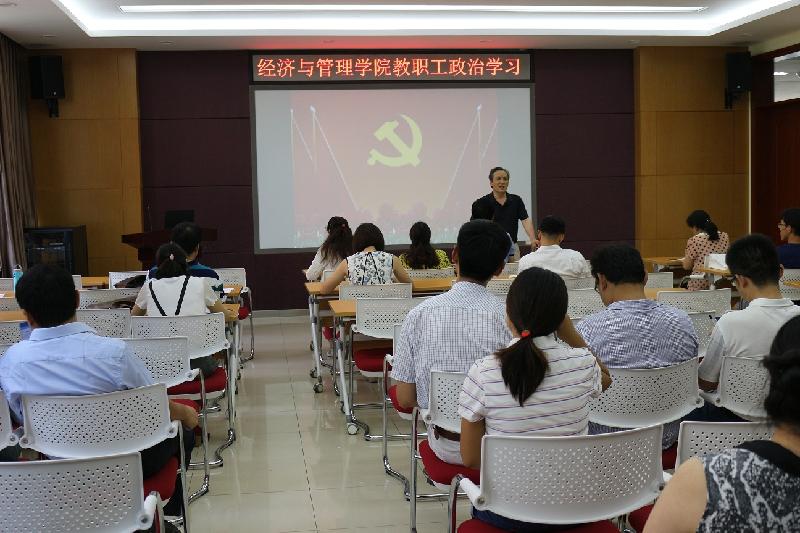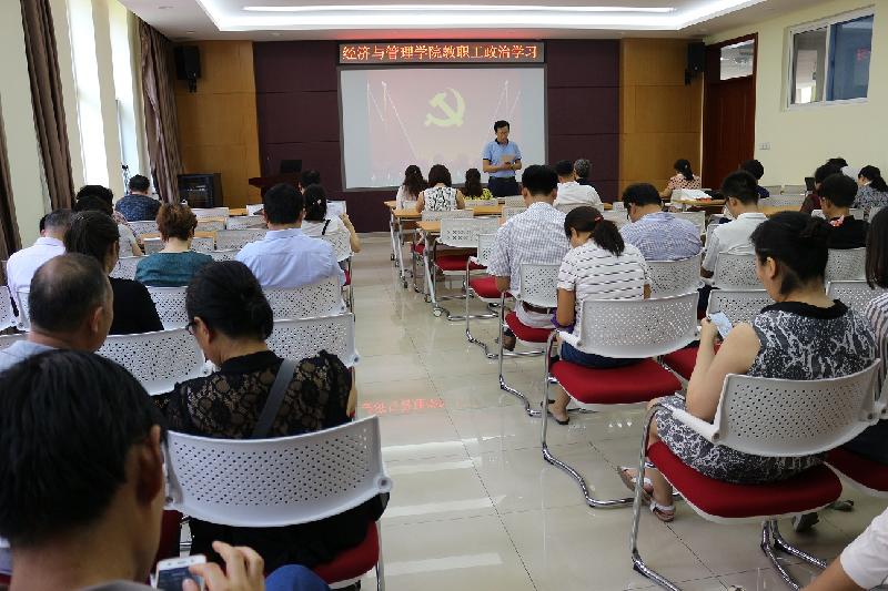 6月27日下午,经济与管理学院全体教职工在1B104开展政治理论学习活动,分党委书记赵中利主持。