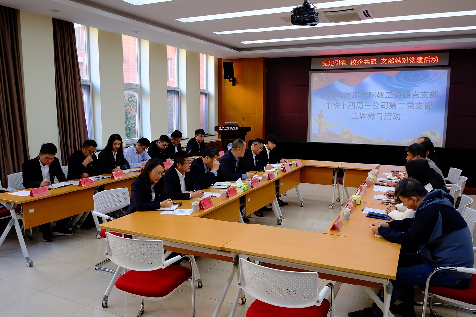 10月23日上午,经济与管理学院教工第四党支部、学生第一党支部与中铁十四局集团第三工程有限公司总部第二党支部联合开展“党建引领,校企共建”主题党日活动。 活动由教工第四党支部书记徐大丰主持。