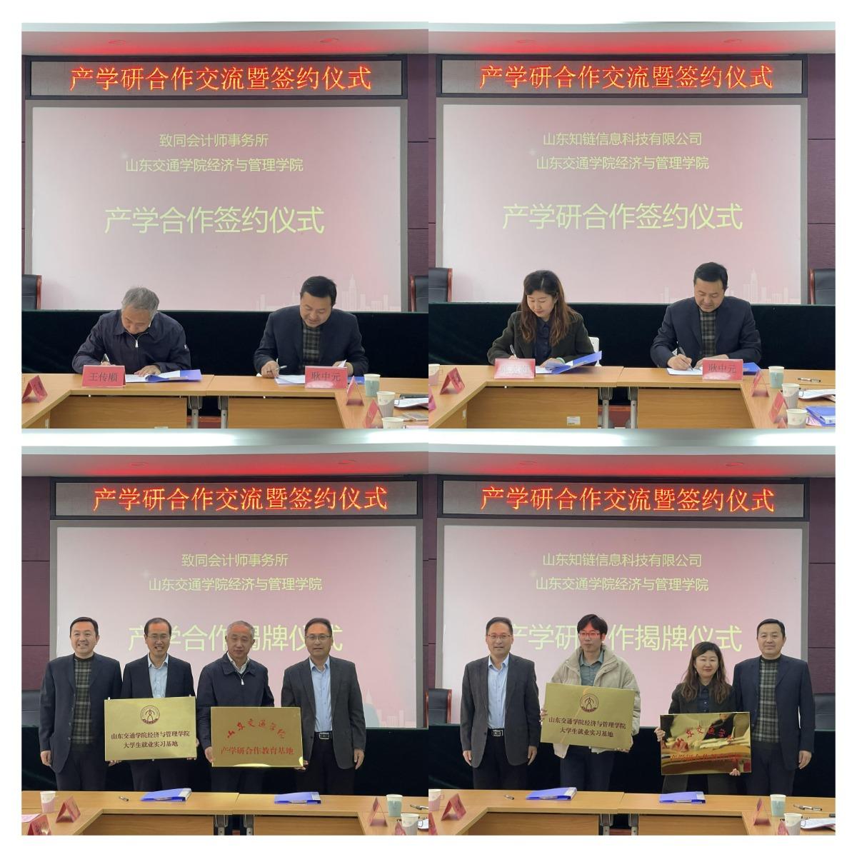 签约仪式上,滕怀国表示此次交流活动是学院深化校企合作的重要举措之一,希望今后校企双方加强产学研合作研究与实践,发挥优势,凝练特色,探索合作机制,丰富合作模式,培养更多适合地方社会经济发展需要的应用型复合经管类人才。耿中元介绍了学院办学特色、学科建设、专业设置、人才培养等情况,提出要做实做强产学研项目,实现校企资源共享,加强应用型人才培养。王传顺和张永娟分别介绍了公司的发展历程和未来战略规划,大数据时代对审计人才与数字经济人才的需求状况,并就学生校外实习、校内实训以及就业指导等方面表达了与院方开展深入合作的意愿。交流结束后,学院与两家合作企业分别签署了产学研合作协议和就业基地协议,并为“山东交通学院产学研教育基地”揭牌。