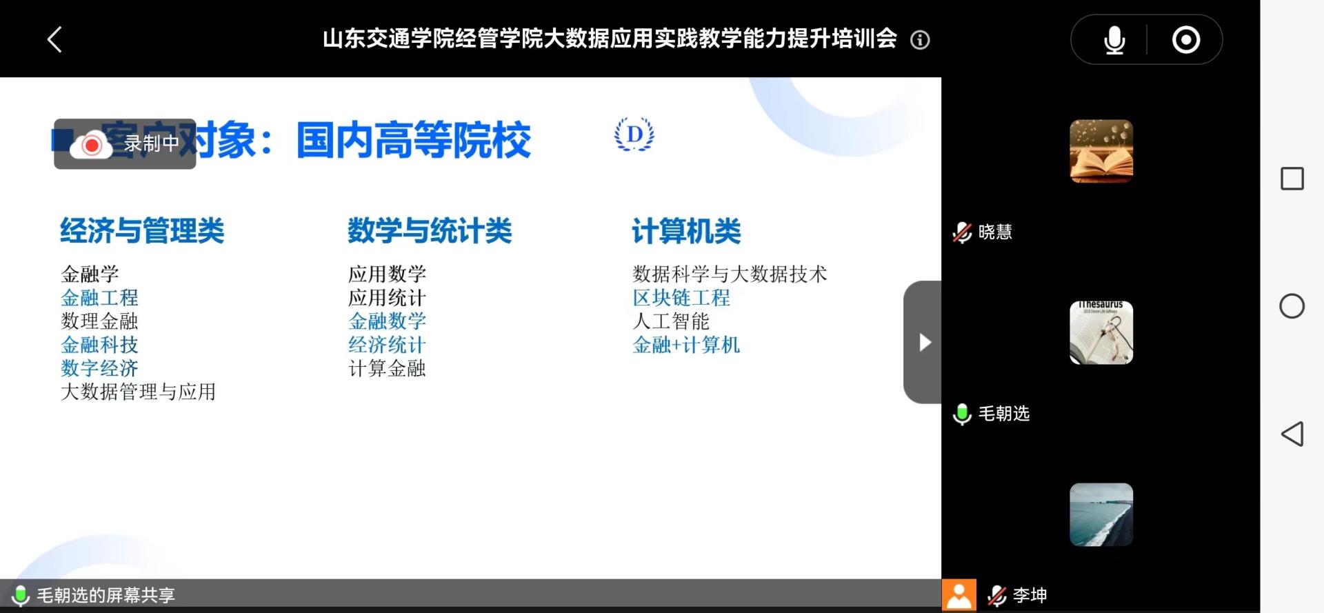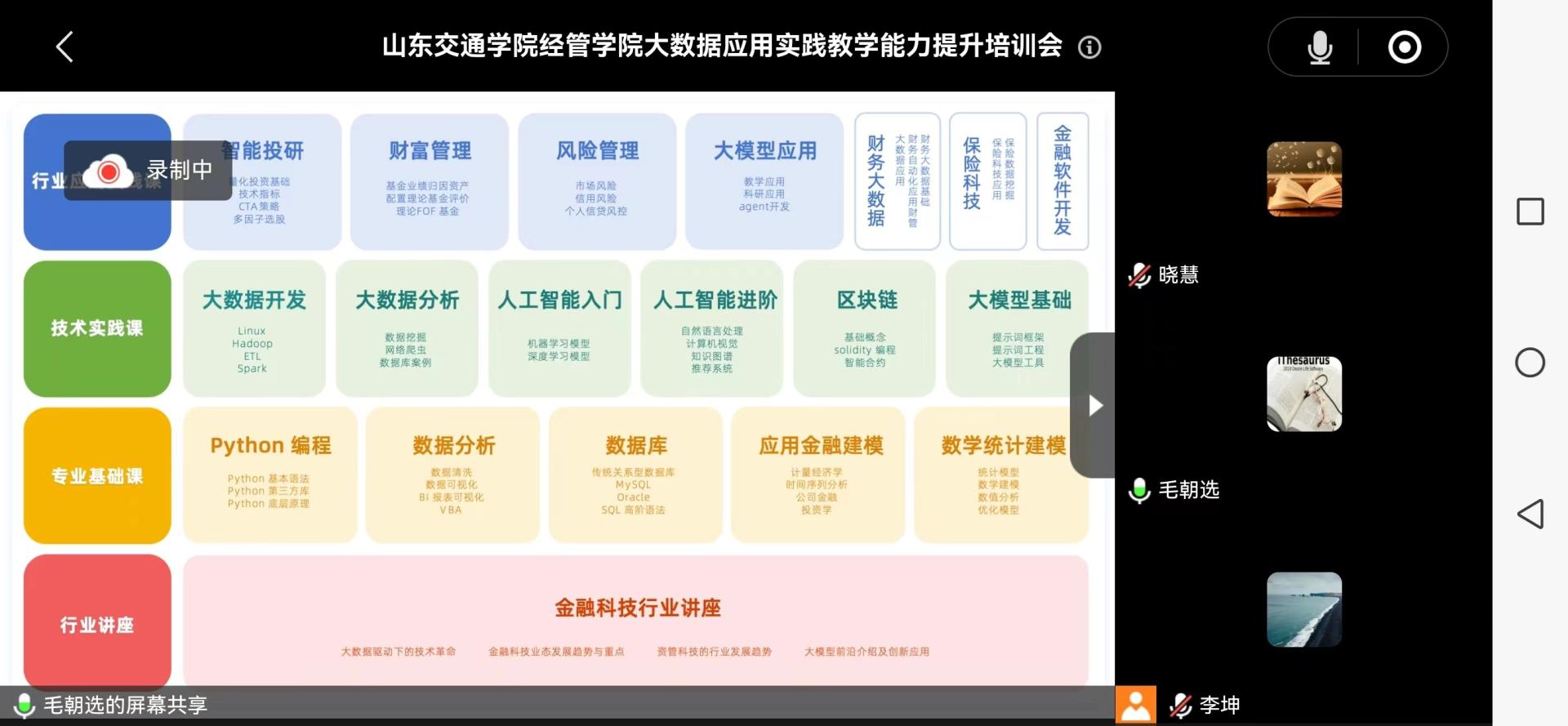 毛朝选重点介绍了AT量化研究交易教学软件、DAS大数据分析与人工智能应用教学软件、BCW区块链实训平台和DQ金融数据平台的课程资源、使用场景及操作流程,并从学科交叉课程建设出发,就新技术手段如何融入一流课程,丰富实践教学资源及实施路径等问题与教师进行深入研讨。