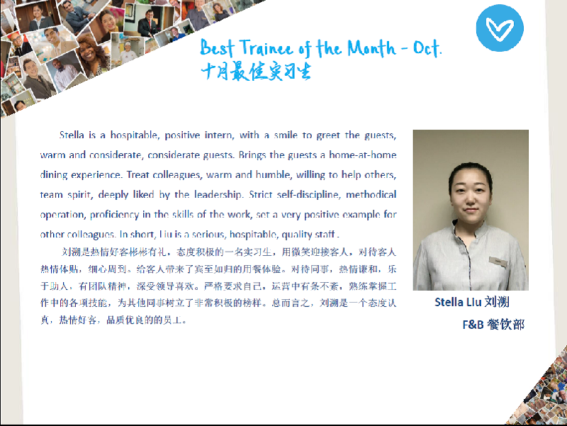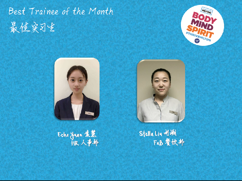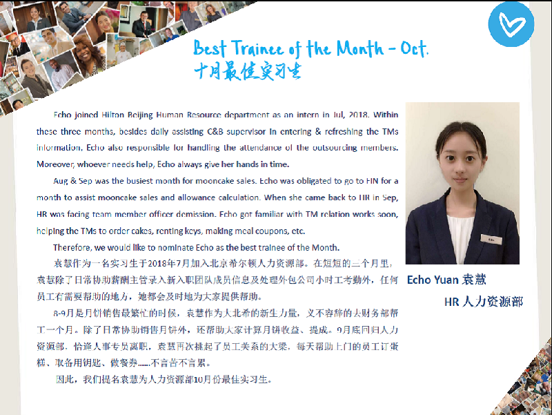 袁慧和刘溯同学于2018年7月加入北京希尔顿,分别在人力资源部和餐饮部实习。在短短三个月的实习过程中,她们迅速适应工作岗位要求,严格要求自己,运营中有条不紊,熟练掌握各自工作岗位要求的各项技能,通过她们的认真努力工作,为客人提供了卓越的住店体验,不断受到客人的好评和认可,并为酒店其他同事和实习生树立了非常积极的榜样。袁慧和刘溯同学作为希尔顿酒店月度最佳实习生,大大加深和提升了校企双方之间的合作,并提高了相关企业对我院旅游管理专业学生的认可度。