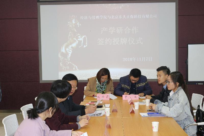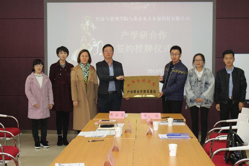 11月7日,我校经济与管理学院同北京东大正保科技有限公司产学研合作教育基地签约暨授牌仪式在1B104举行。经济与管理学院常务副书记王洪鹏、副院长聂云霞、审计会计系主任孔萍及教师代表,企业方领导及代表,出席了本次签约仪式。