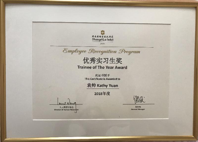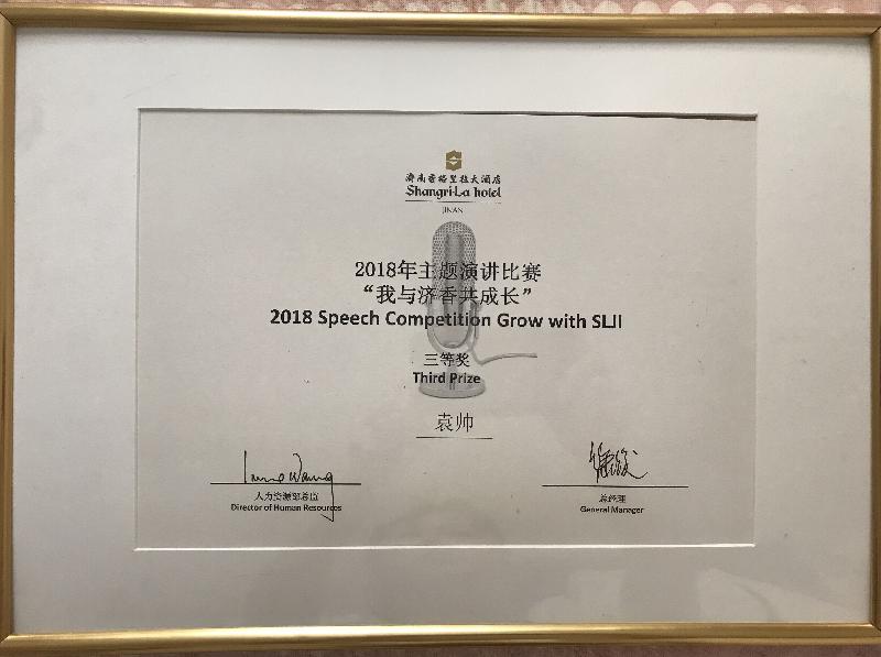 我院2016级旅游管理专业袁帅同学,于2018年7月进入五星级酒店——济南香格里拉大酒店人力资源部实习,除了日常工作,还负责酒店员工宿舍的各项事务,如维持平时宿舍秩序,卫生保持,组织协助宿舍消防培训。在酒店日常运营中还与小时工公司进行工作对接,及时为酒店各项大型宴会活动招募帮工,得到了餐饮及相关部门的肯定和好评。实习期间积极参与酒店的各类活动如:酒店员工趣味运动会、实习生欢送会、慈善义卖会、拔河比赛、包包子、包饺子大赛、演讲比赛以及每个月的生日会等。在庆祝酒店开业一周年的演讲比赛中获得第四名的好成绩。