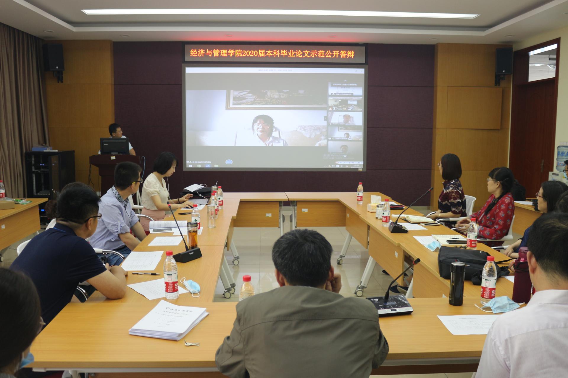 特殊毕业季,答辩不延期。5月27日下午,经济与管理学院2020届本科毕业设计(论文)示范公开答辩线上线下同步进行。经过遴选,6名优秀毕业生利用腾讯会议线上答辩。15个答辩小组的答辩组长和答辩秘书在学院会议室1B104线下观摩,其他论文指导教师和近300名毕业生线上观摩。本次示范答辩由审计系主任孔萍主持。