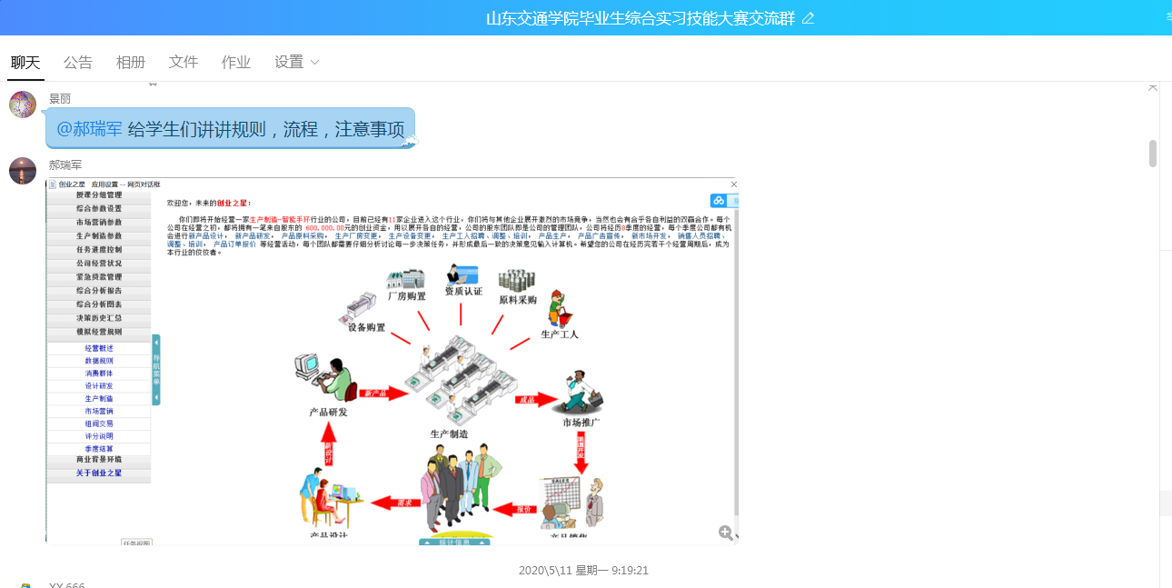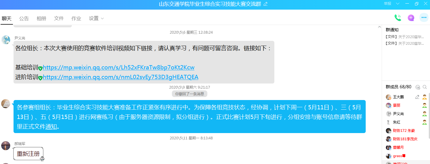 为保障实习及大赛质量,精心策划,做好赛事策划、组织、宣传等方面的工作。一是通过学校办公系统正式发出线上实习倡议暨2020届毕业生综合实习技能大赛通知,邀请各学院积极组织毕业生参与;二是拟定大赛方案,确定线上实习时间、赛事流程、成绩评定规则及注意事项;三是创建QQ群,建立与毕业生之间直接沟通渠道,发布实习及大赛相关资源;四是通过已报名加群学生转发宣传线上实习暨大赛通知,设定赛事奖励,激励毕业生全面参与。